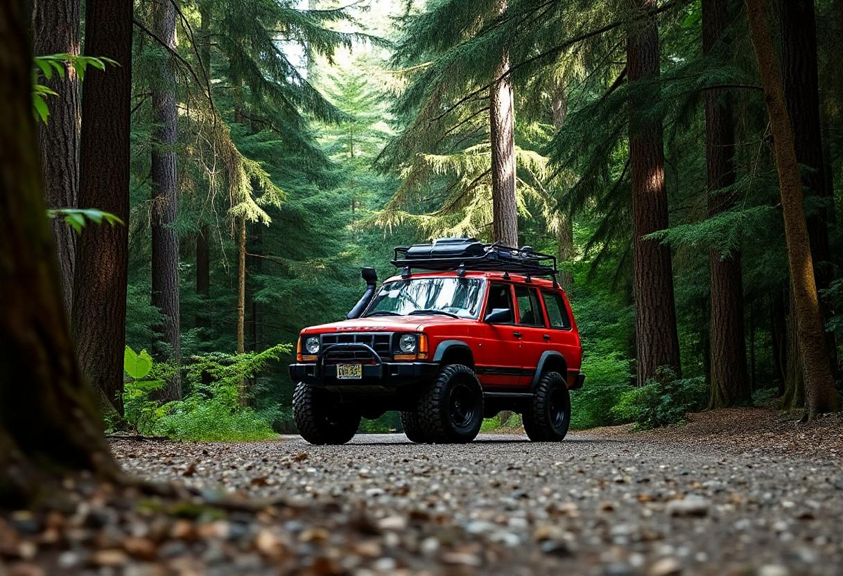 A red SUV with a roof rack drives through a forest on a gravel road. The car is surrounded by tall green trees.