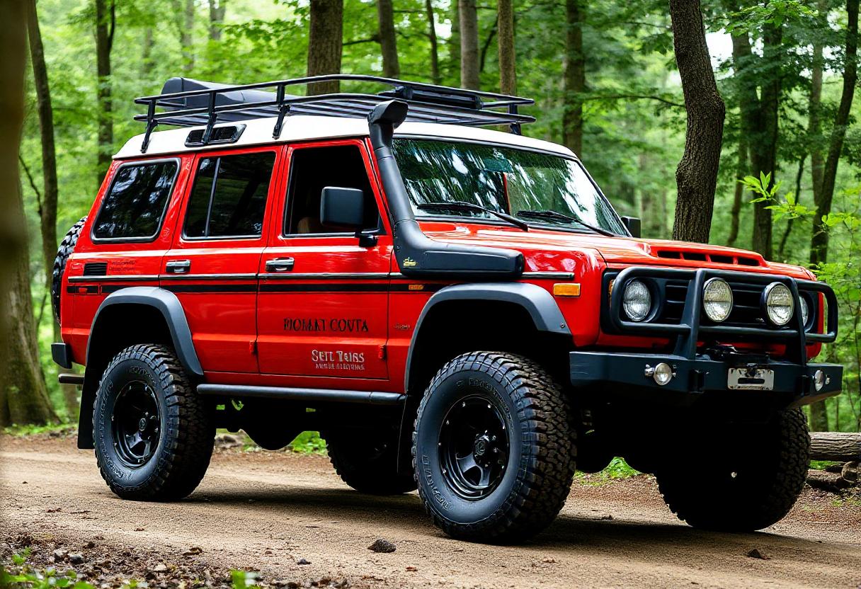 A red off-road vehicle with a roof rack is parked on a dirt road in a forest. The vehicle has large tires and a black bumper with a winch.