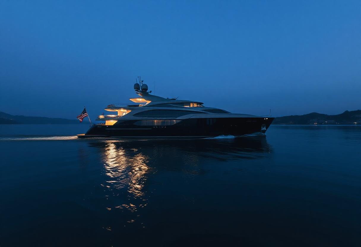 A black yacht sails through calm water at night, with lights on and the silhouette of a nearby island in the background.