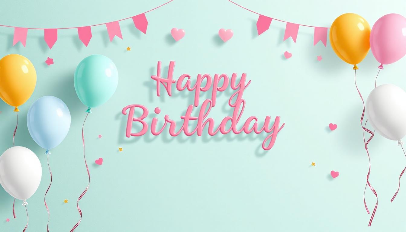 Blue background with pink Happy Birthday text, colorful balloons, confetti, and pink flags at the top