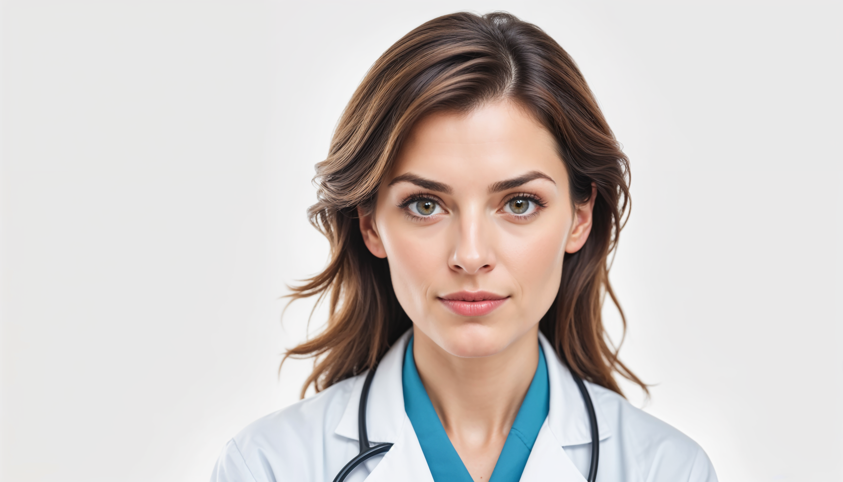 A woman with long brown hair, wearing a white lab coat with a blue undershirt and a stethoscope around her neck, looks directly at the camera.