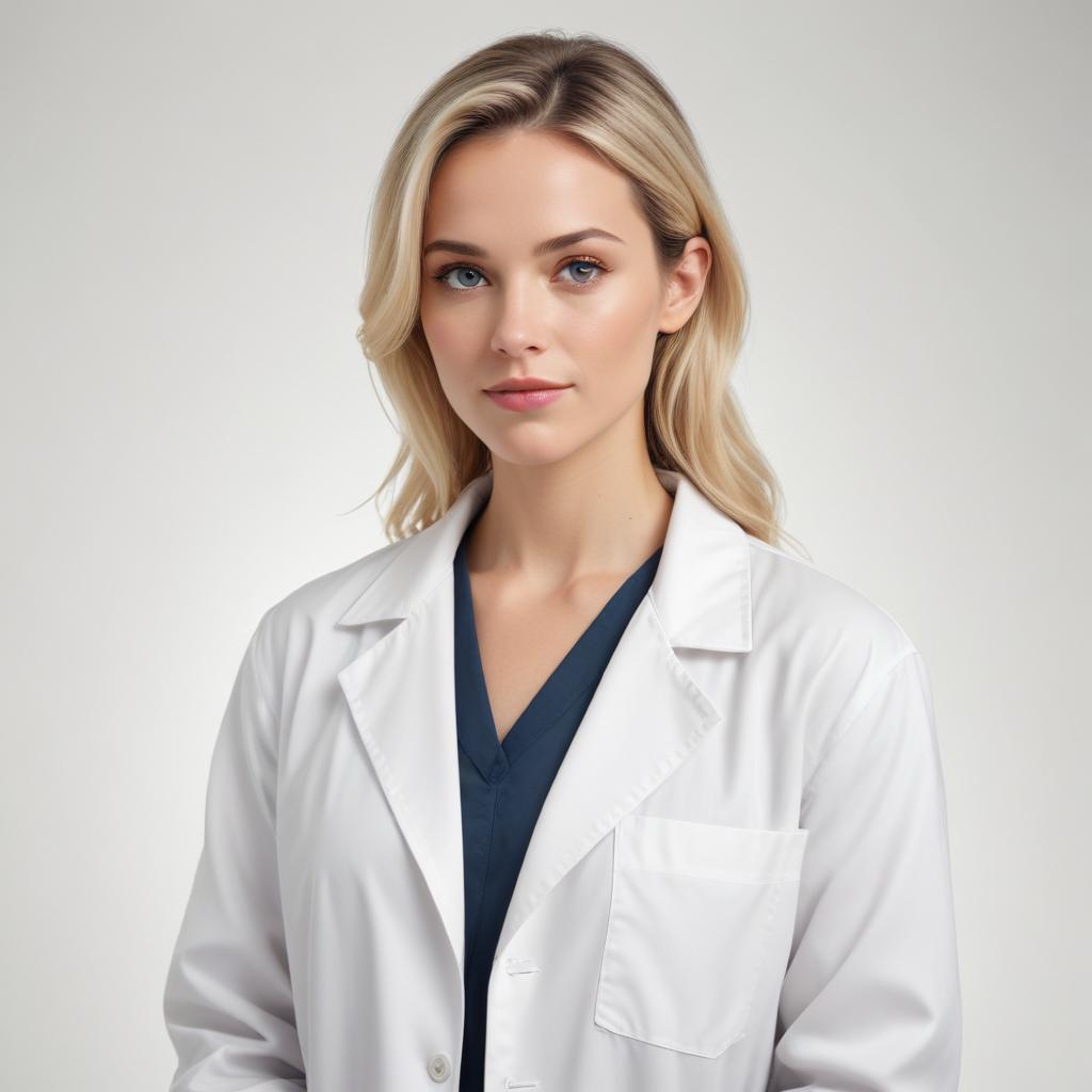 A young woman with blonde hair and blue eyes is wearing a white lab coat. She is looking directly at the camera. The background is white.