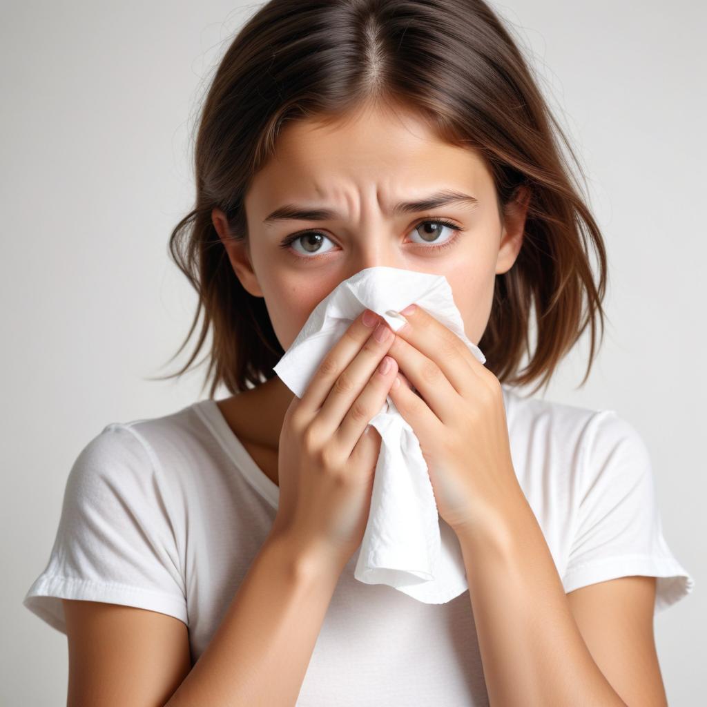A woman blows her nose with a tissue