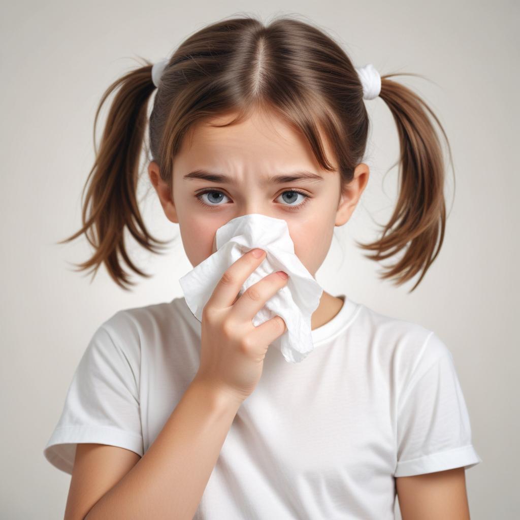 A girl blows her nose with a tissue