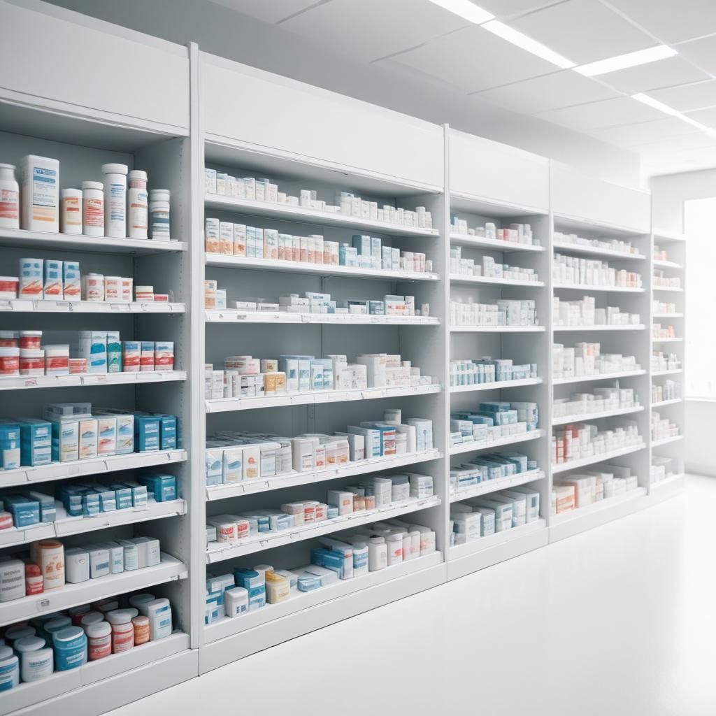 A pharmacy interior with rows of white shelves stocked with various medicines.