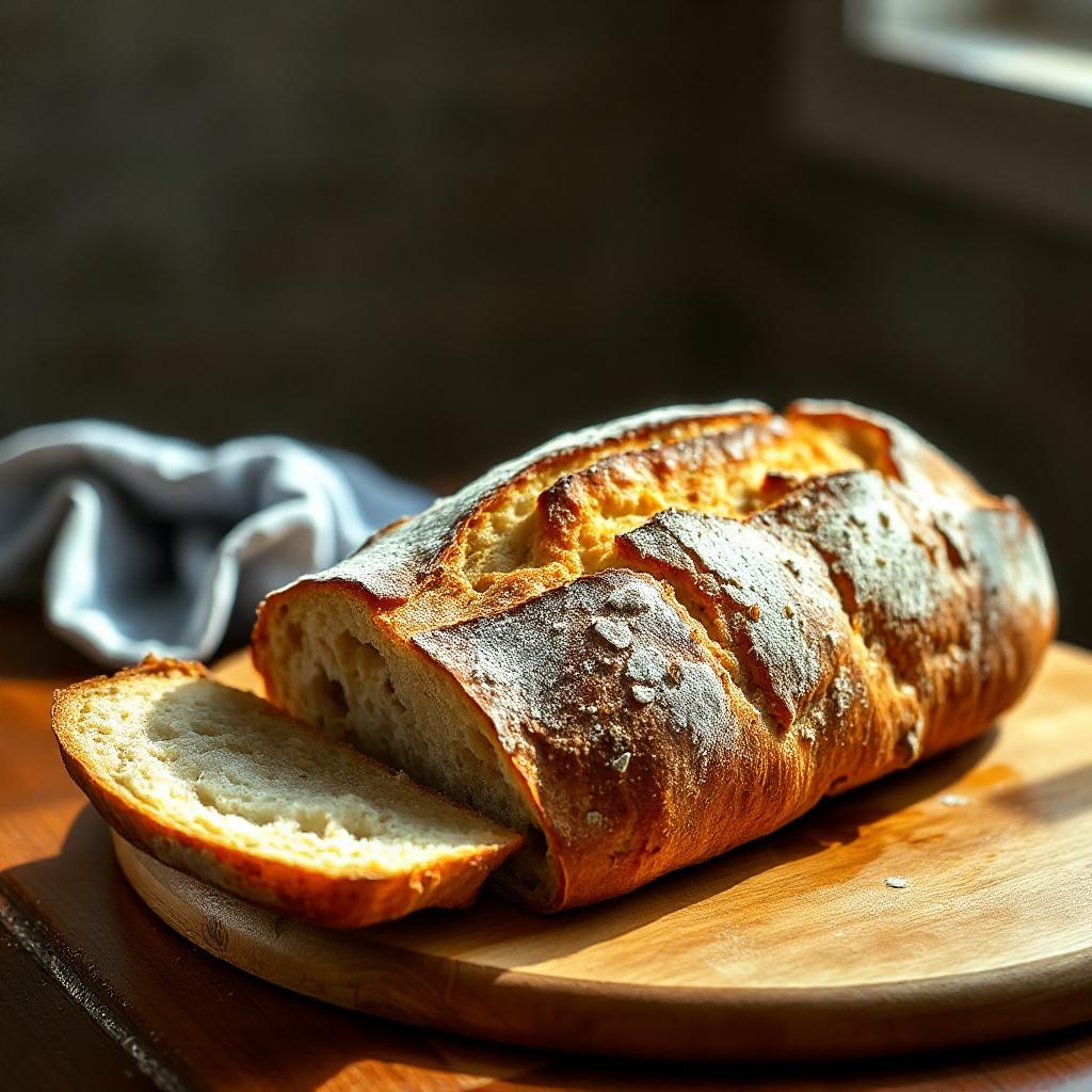A warm, freshly baked loaf of bread, lightly dusted with flour, sits on a wooden board with one slice resting beside it