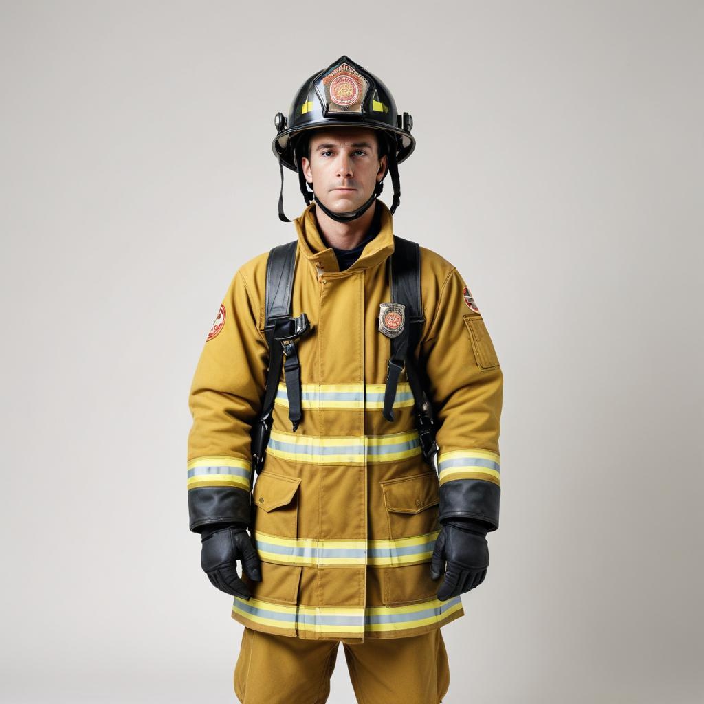 A firefighter wearing a yellow jacket, black gloves, and helmet stands in front of a plain background.