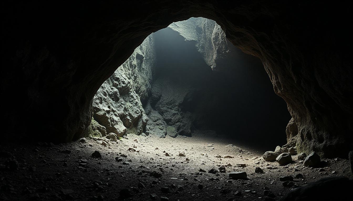 A dark cave with a light source shining through the entrance, illuminating the rocky floor.