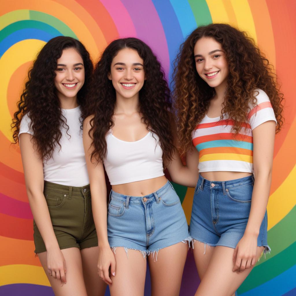 Three young women with curly hair stand before a bright rainbow backdrop, dressed in casual summer outfits and smiling