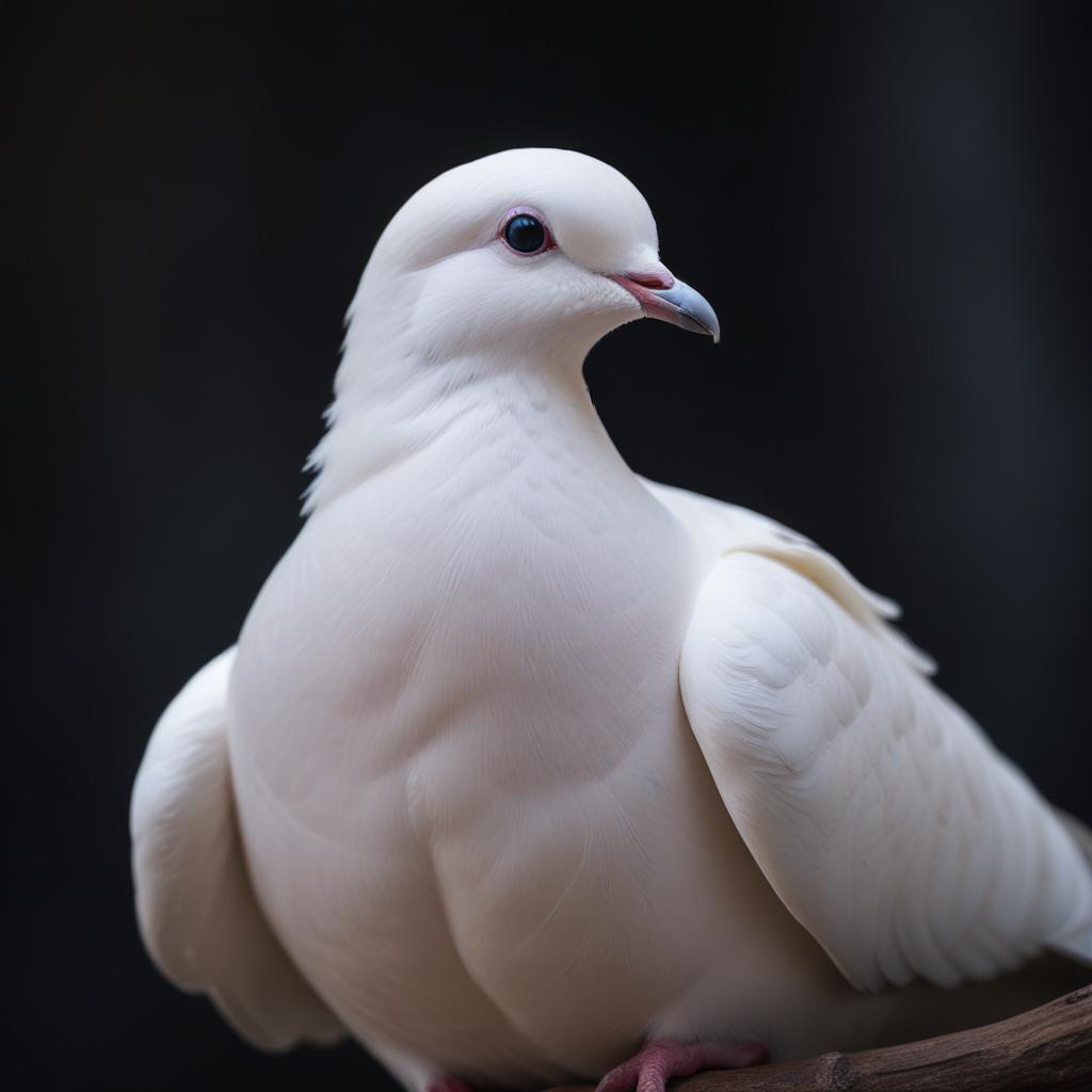 A white dove with black eyes sits perched on a branch. The dove is facing right and looking towards the camera. The background is black.