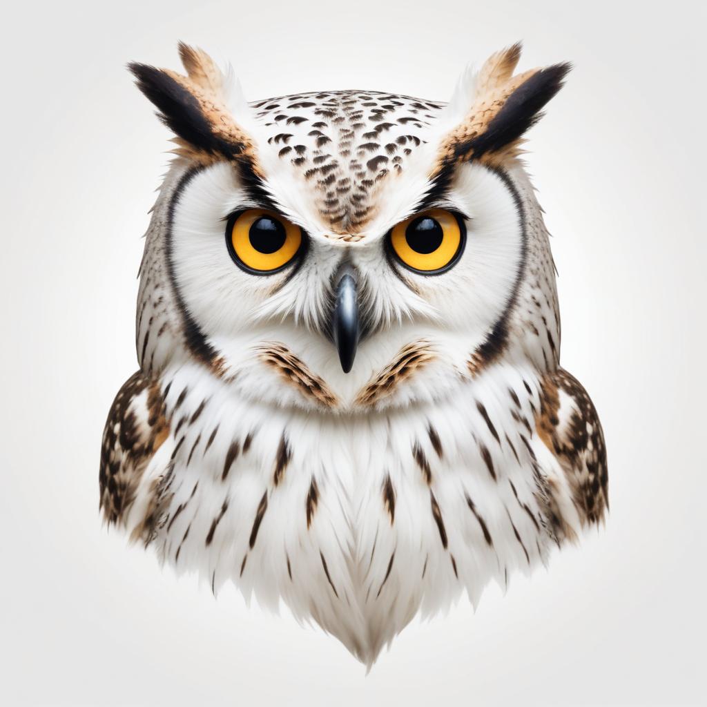A snowy owl with yellow eyes looks directly at the viewer. Its white feathers are speckled with black and brown, and its beak is black.