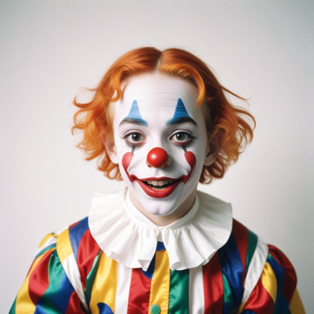 A young person in a colorful clown costume and makeup smiles at the camera, sporting red hair and a white ruffle collar