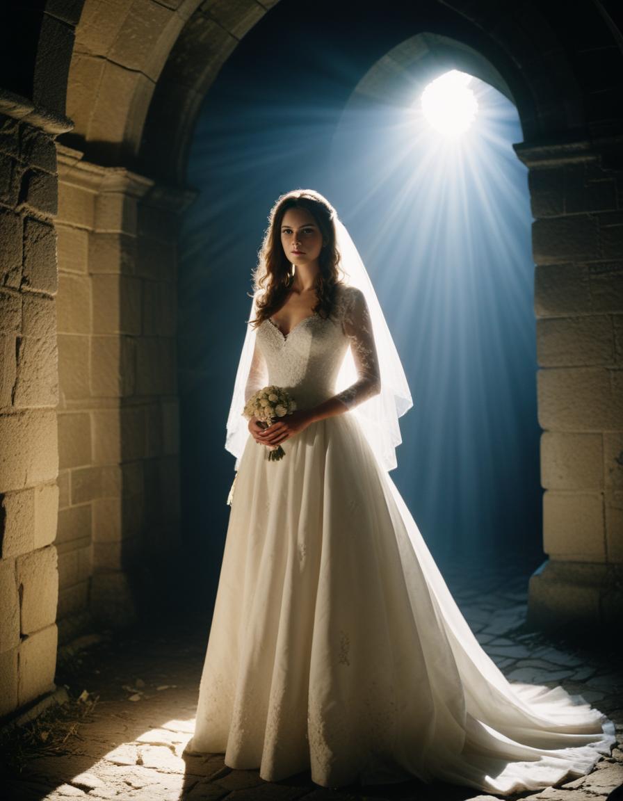 A bride wearing a white dress and veil stands in a stone archway with a bouquet of flowers in her hand. Light shines through the archway.