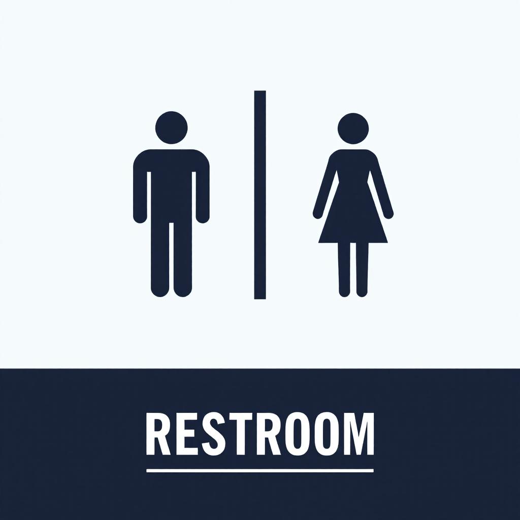A white sign reads RESTROOM with a male and female silhouette on the sides and a vertical line in the center