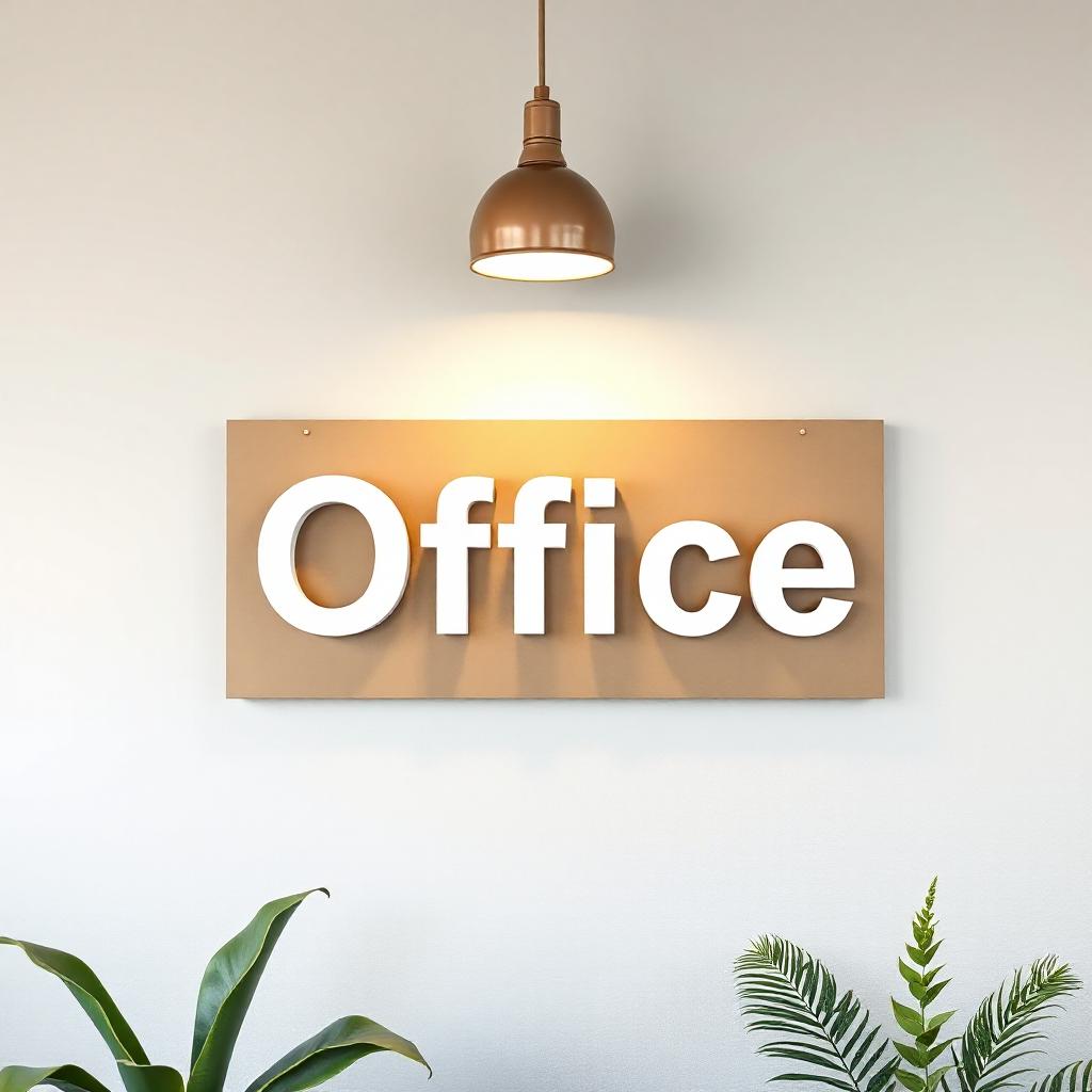 A white Office sign with 3D lettering hangs on a white wall. A light fixture is suspended above the sign and plants are visible on either side.