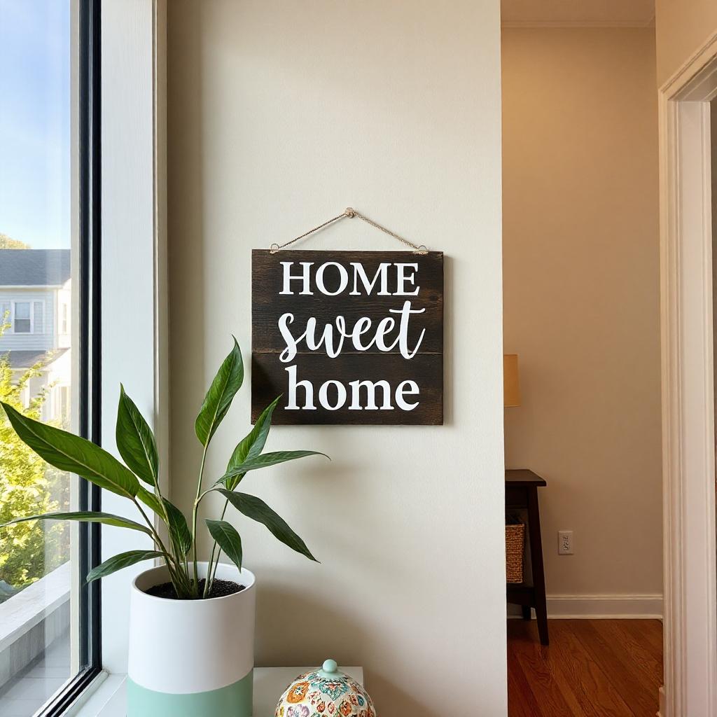 A white wall displays a wooden sign reading Home sweet home, strung with twine, next to a potted plant on the left