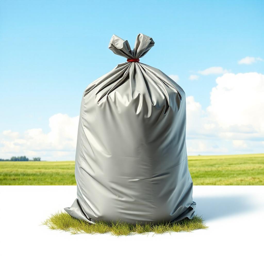 A gray garbage bag tied with a red band sits on green grass, framed by a field and blue sky with white clouds