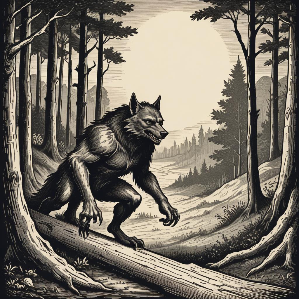A werewolf with sharp claws and fangs walks along a fallen log in a dense forest. The sun is setting and the sky is filled with clouds.