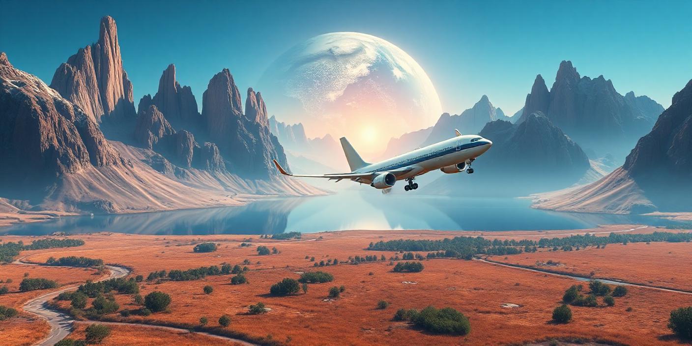 An airplane soars over rugged mountains and a lake, as a large planet hangs in the sky with the sun setting in the distance