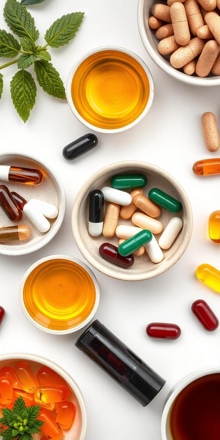 Various types of pills, capsules, and supplements are arranged in small bowls on a white background, along with some herbs and other liquids.