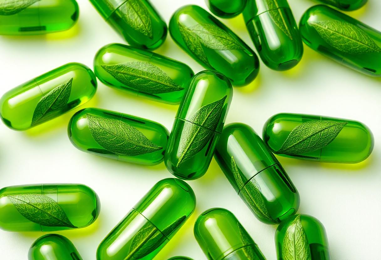 A close-up shot of green capsules containing leaves, scattered on a white surface.
