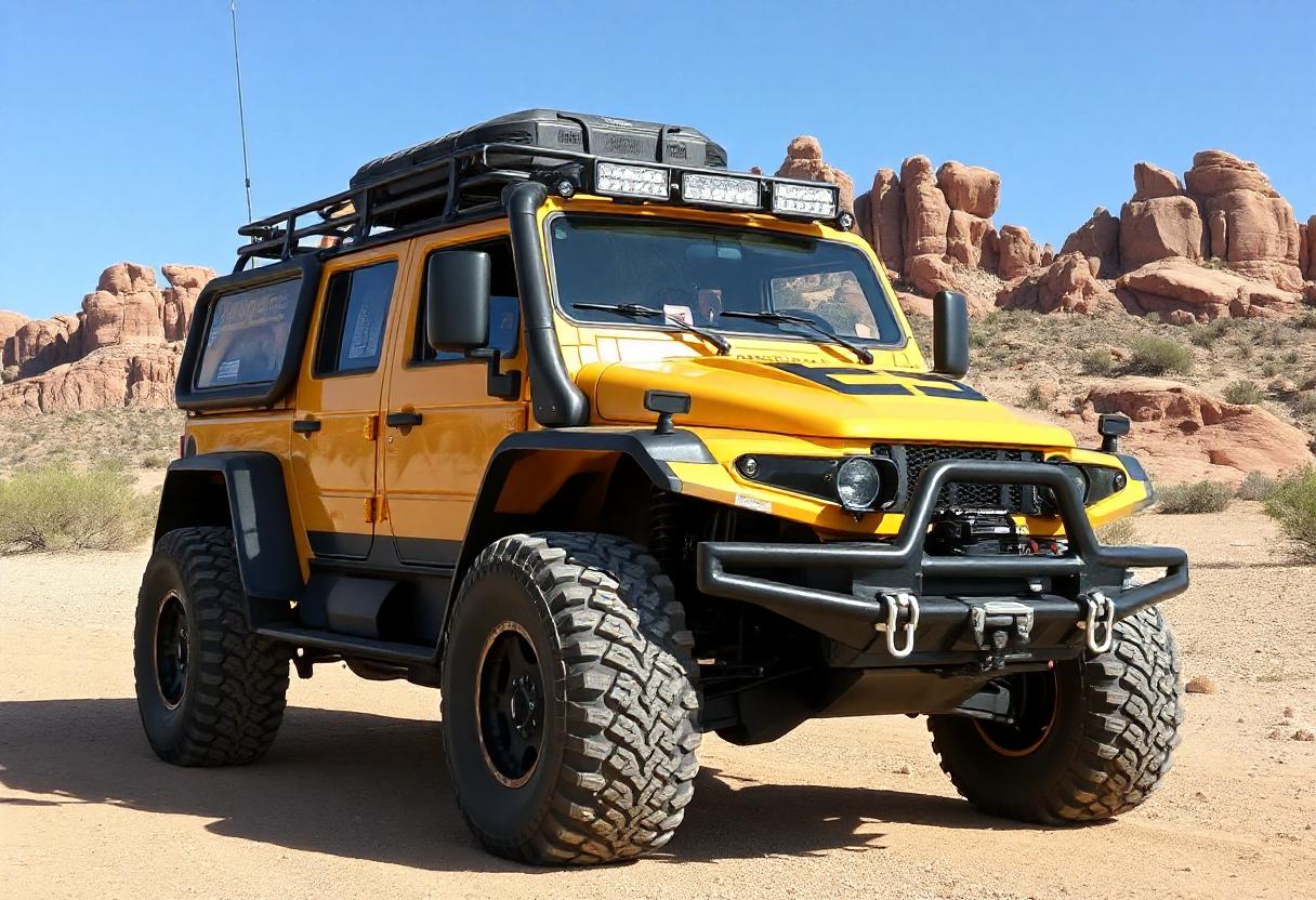 A yellow off-road vehicle with a roof rack and large tires is parked in a desert setting with red rock formations in the background.