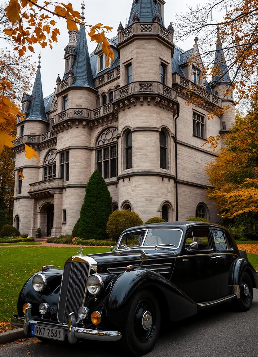 autumn, black, car, castle, classic, colors, driveway, fall, grand, grass, leaves, parked, paved, road, stone, street, tall, towers, trees, vintage