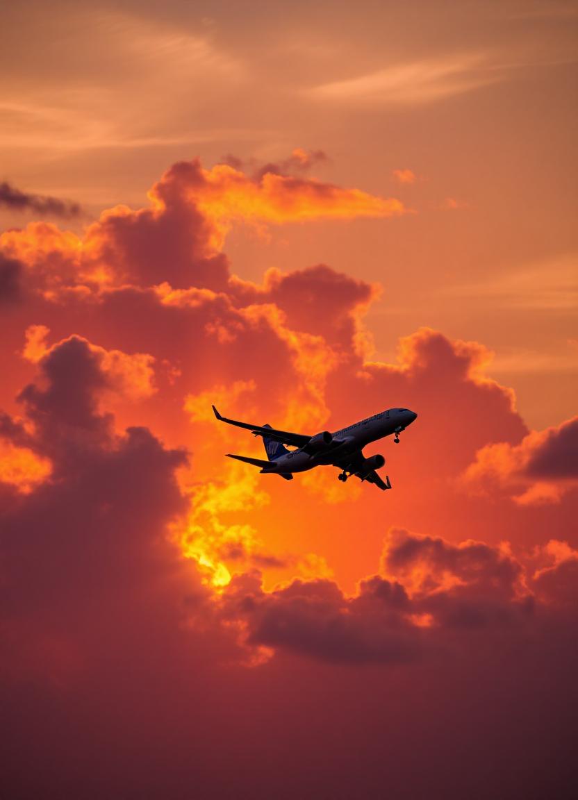 air, airliner, airplane, aviation, clouds, cloudscape, commercial, dusk, evening, flight, fly, golden, hour, orange, red, silhouette, sky, sunset, transportation, travel