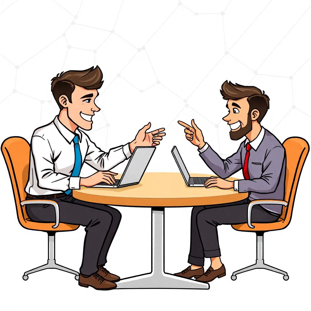 Two men are sitting at a desk, facing each other, with their laptops open. They are smiling and gesturing with their hands as they work.