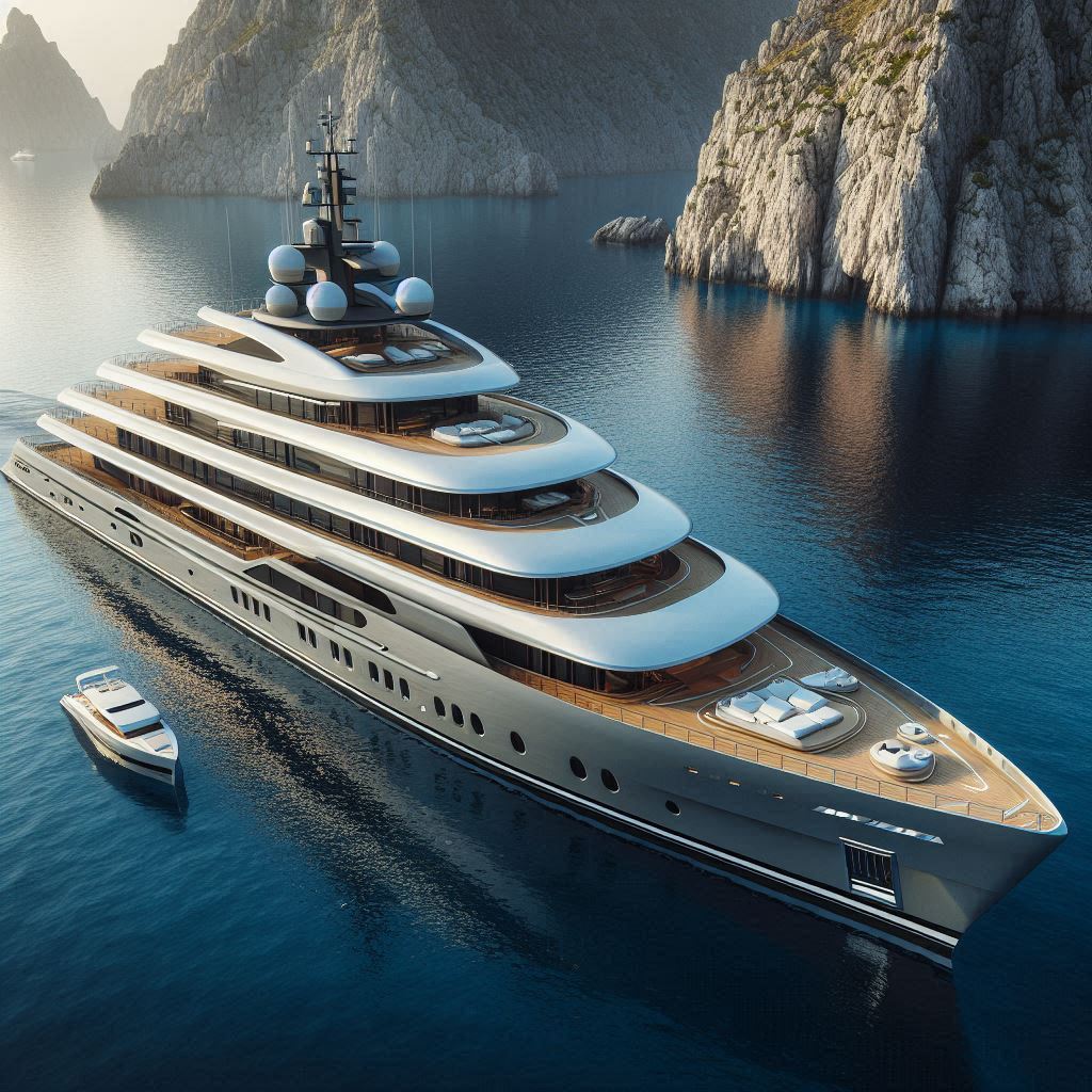 A large, gray yacht with a wooden deck is docked in the water, surrounded by rocky cliffs. A smaller, white boat is docked nearby.