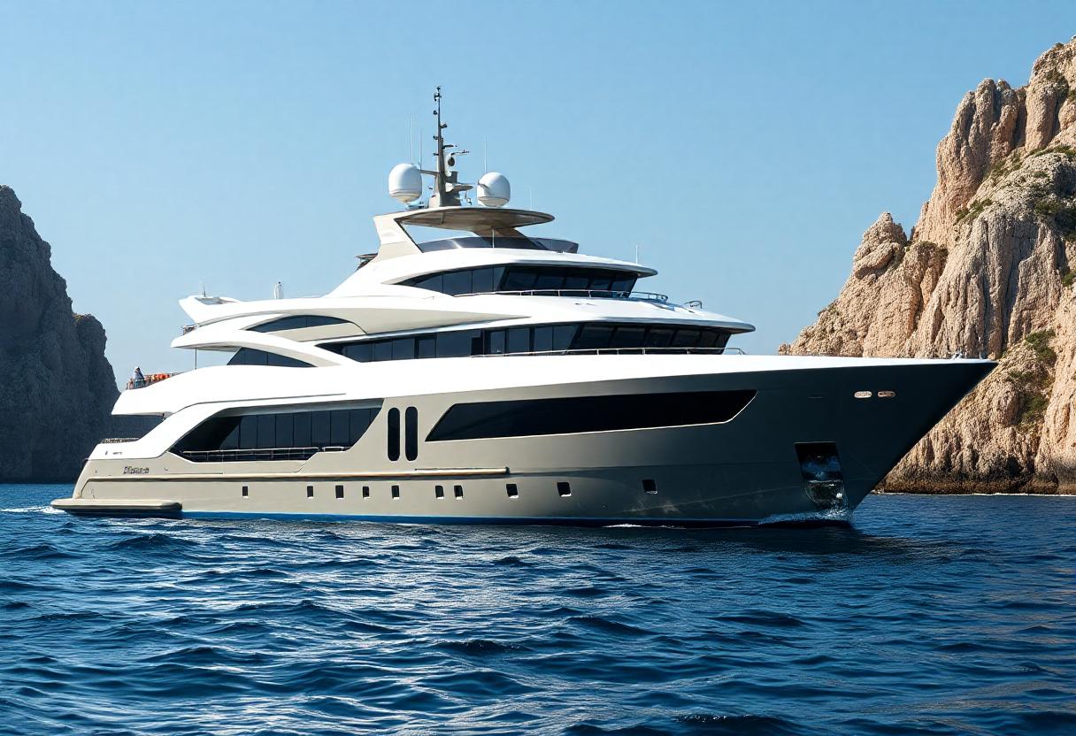 A sleek white yacht with a gray hull glides past rocky cliffs on a clear day, its spacious deck gleaming over calm blue waters.