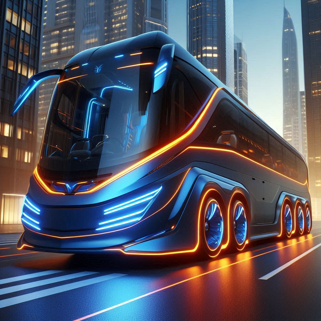 bus, city, design, driving, future, futuristic, glowing, light, modern, neon, night, sleek, speed, street, technology, transportation, travel, urban, vehicle, windows