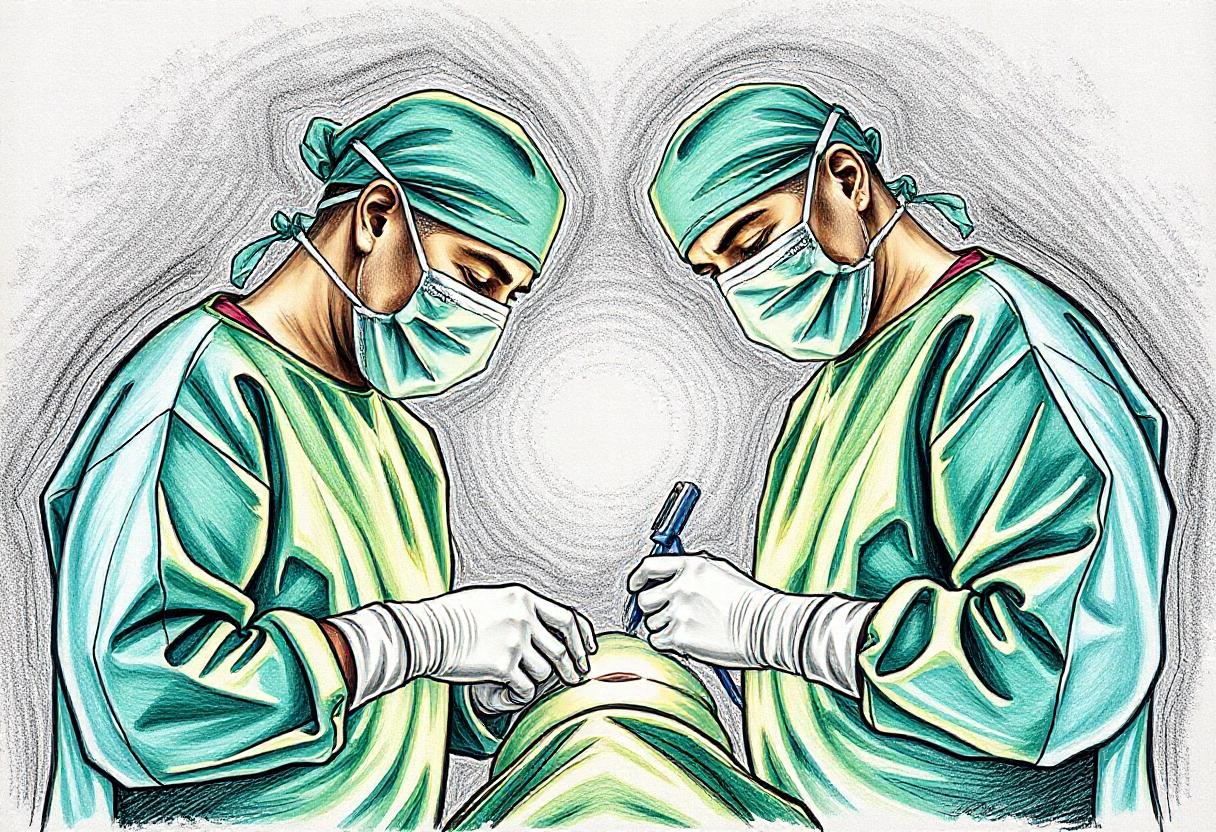Two surgeons in green scrubs and masks are intently operating on a patient, with one holding a surgical tool.
