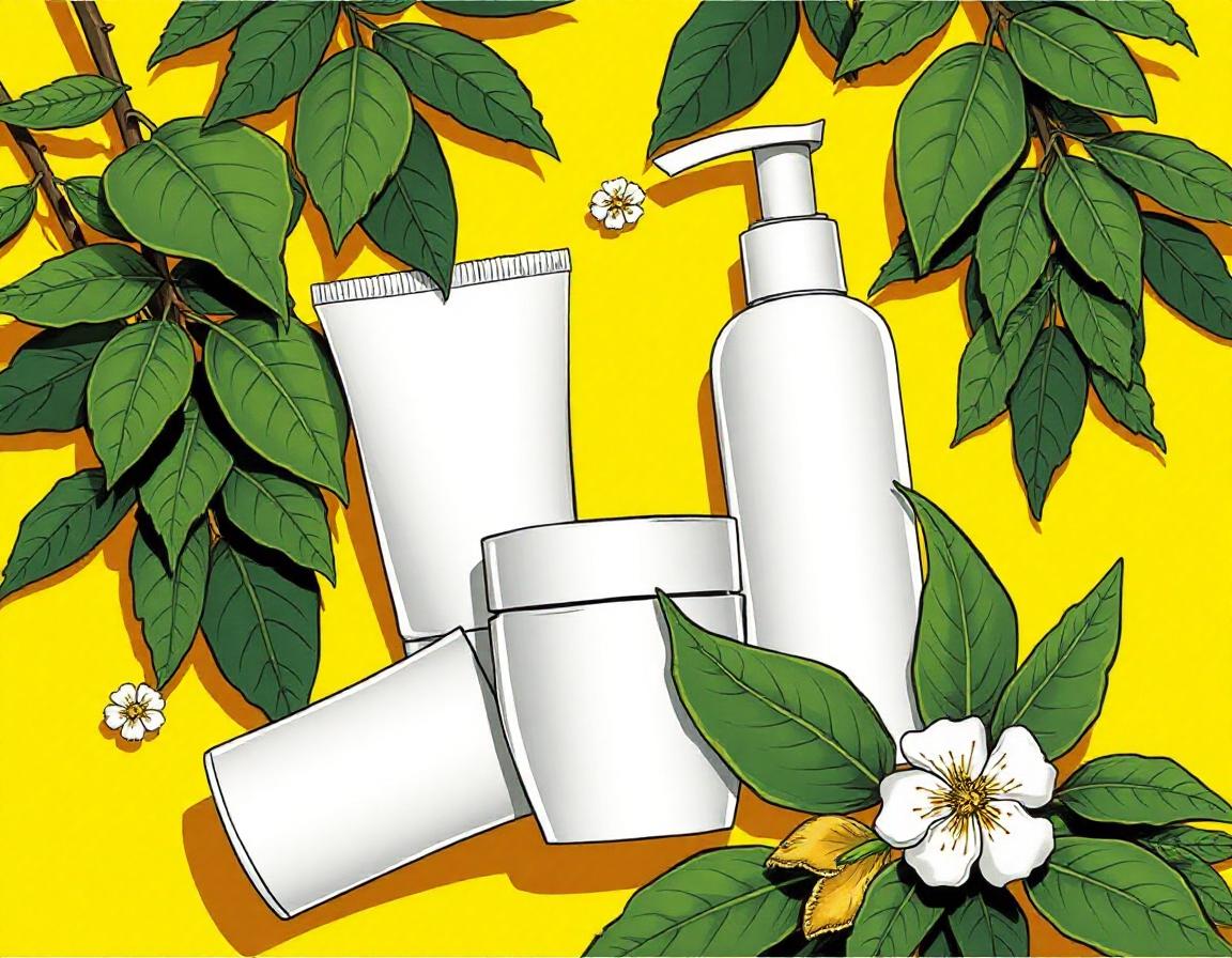 Three white bottles of lotion and cream surrounded by green leaves on a yellow background.