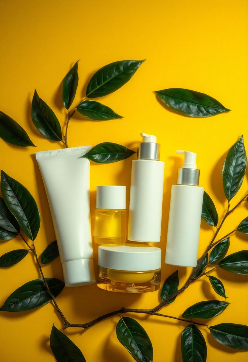 Five white cosmetic bottles on a yellow background, two with pumps. One holds yellow liquid; another has a clear lid with yellow cream.