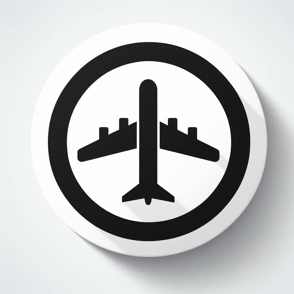 A black and white icon depicting an airplane in a circle with a black outline, on a white background.