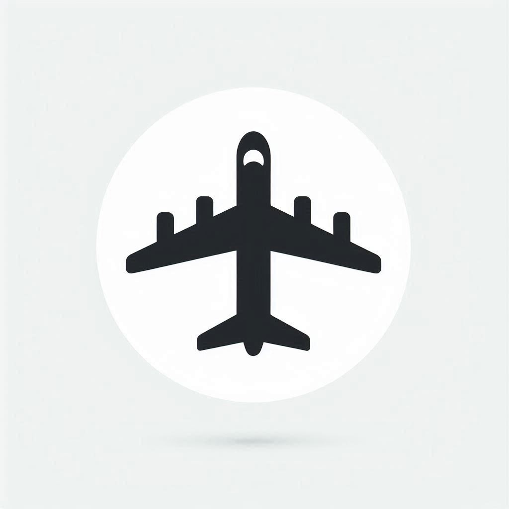 A black silhouette of an airplane is displayed in a white circle against a light grey background