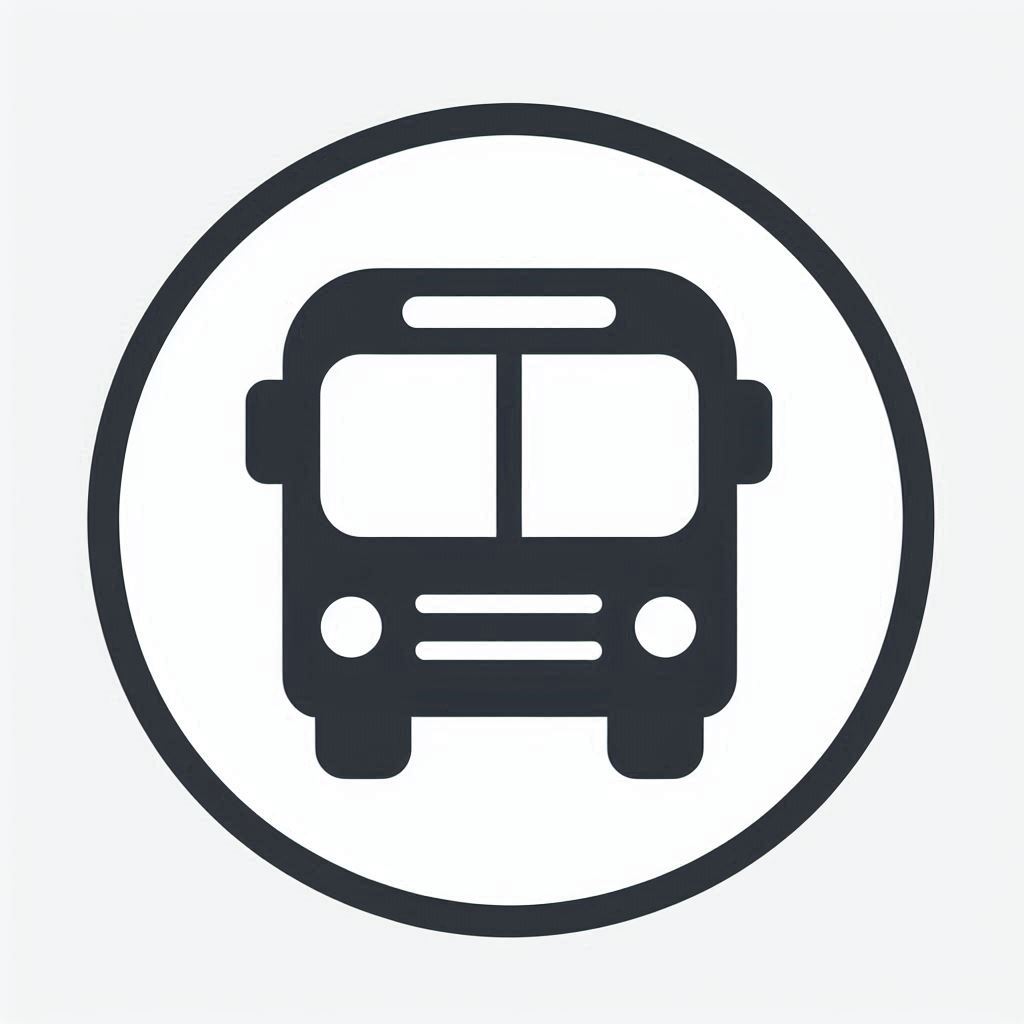 A black and white icon of a bus in a circle. The bus is facing forward with its headlights on.