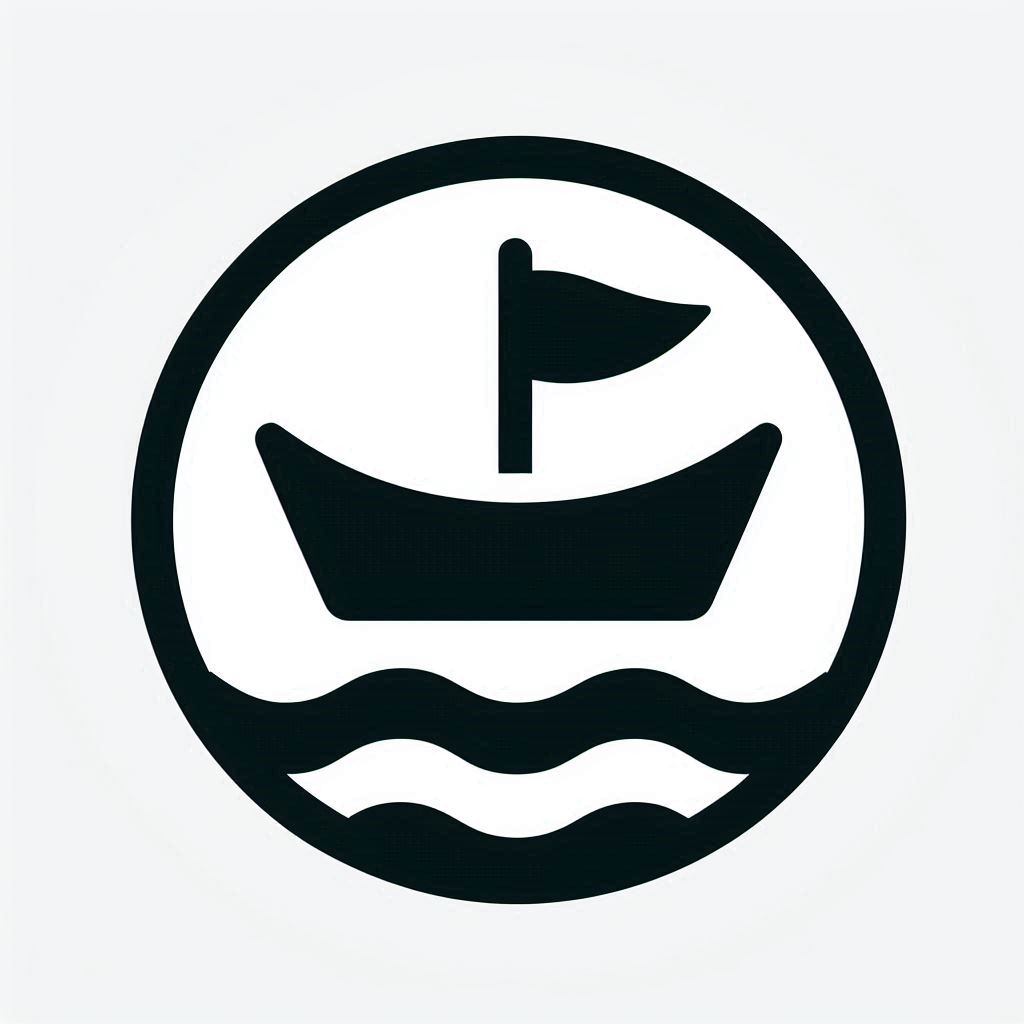A black and white icon depicting a boat with a flag in a circle surrounded by wavy lines representing water.