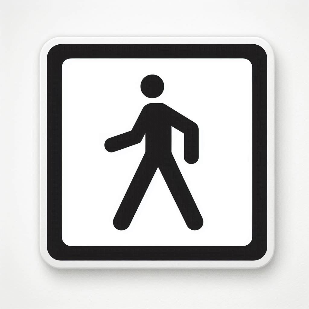 A white square sign with a black border and a black silhouette of a person walking inside the sign.