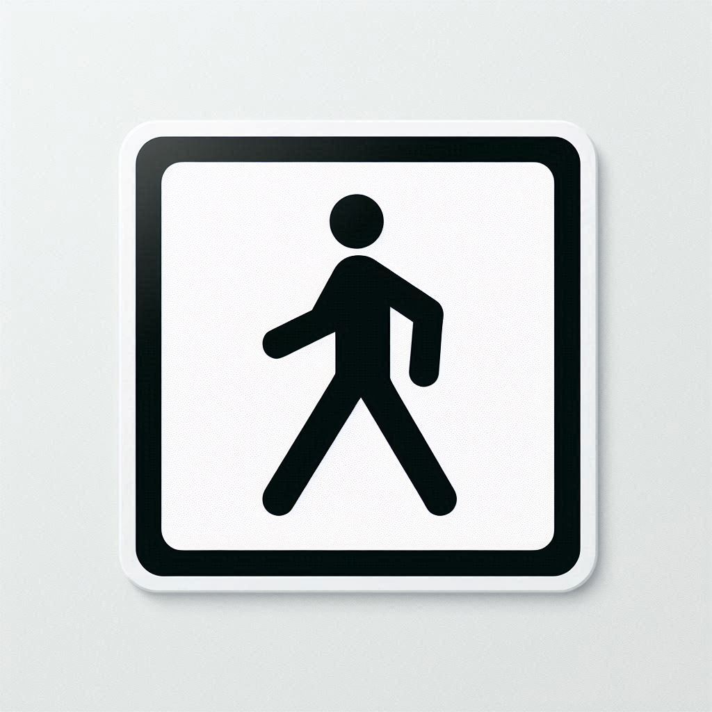 A pedestrian crossing sign with a black stick figure walking is displayed on a white wall.