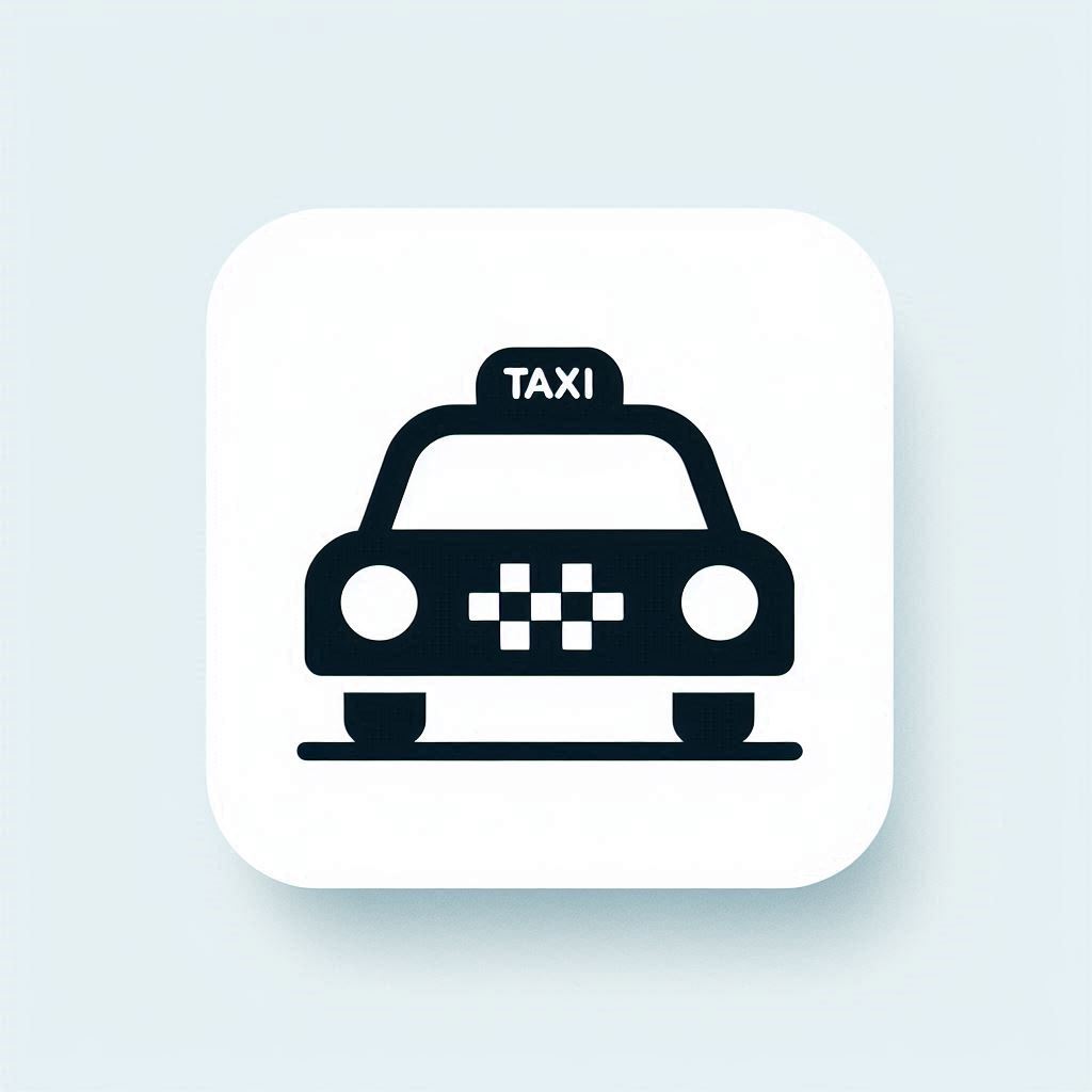 A simple black and white icon of a taxi. The car is facing forward and has a Taxi sign on the roof.