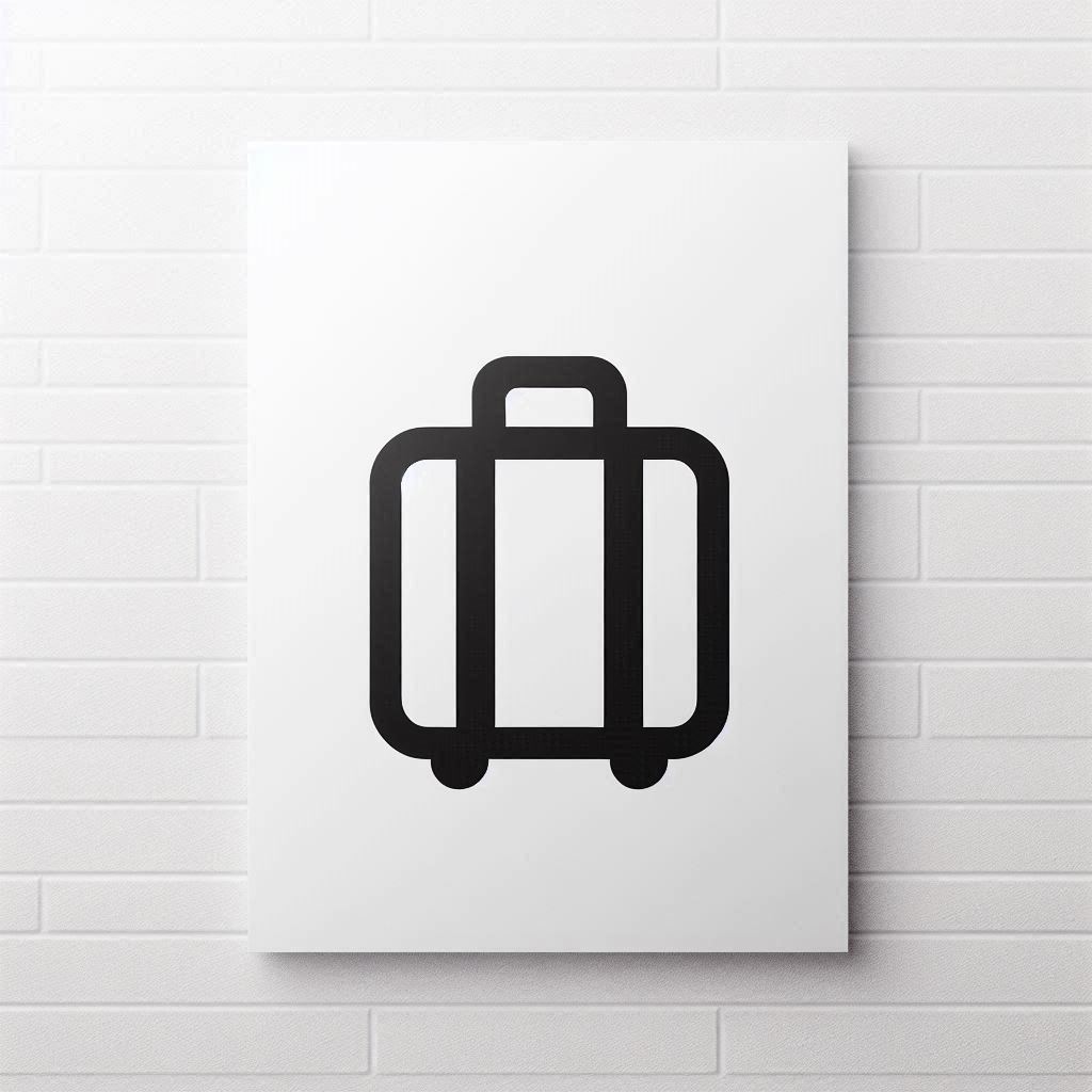 A black suitcase icon is printed on a white canvas, which is hung on a white brick wall.