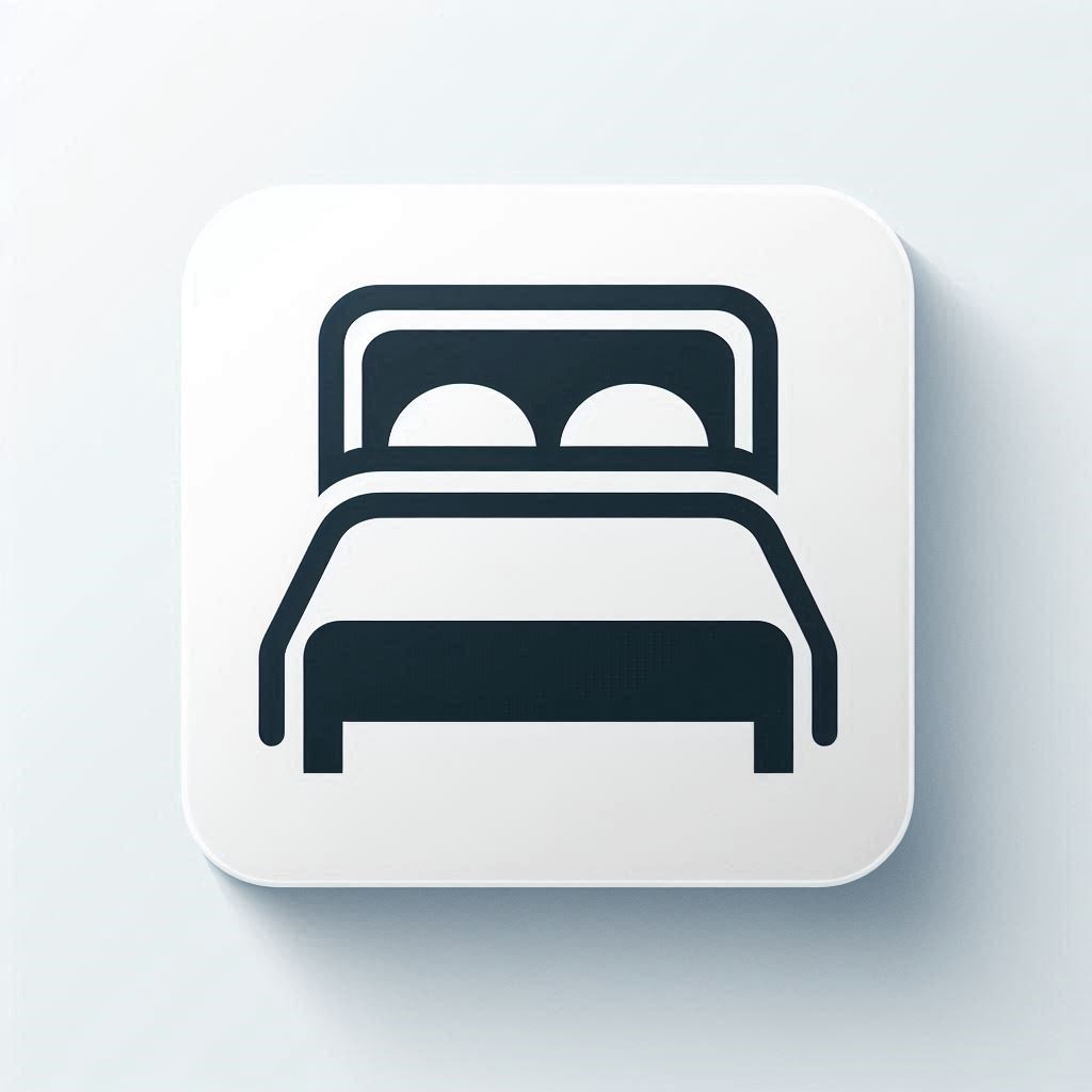 A black and white icon of a bed with two pillows on a white square. The icon has a shadow beneath it, giving it a three-dimensional look.