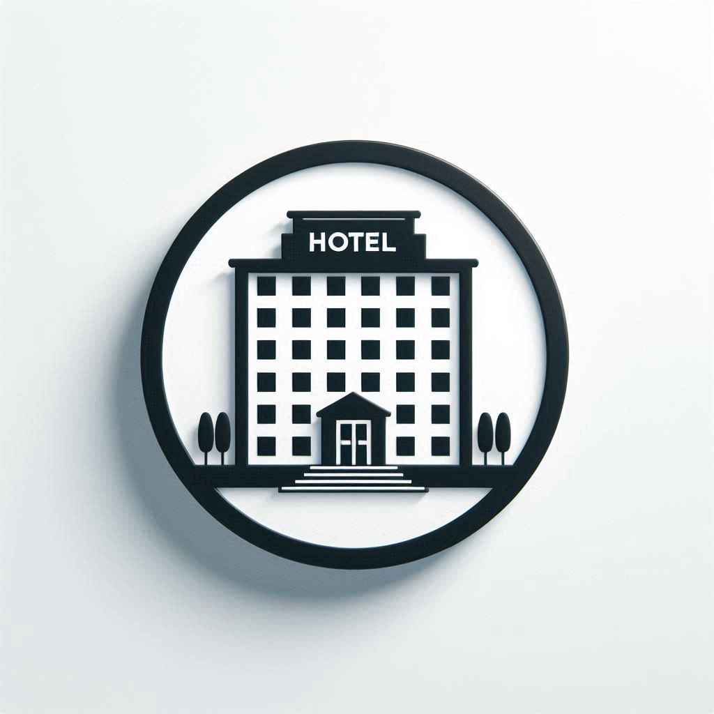 A black and white hotel icon is featured on a white background