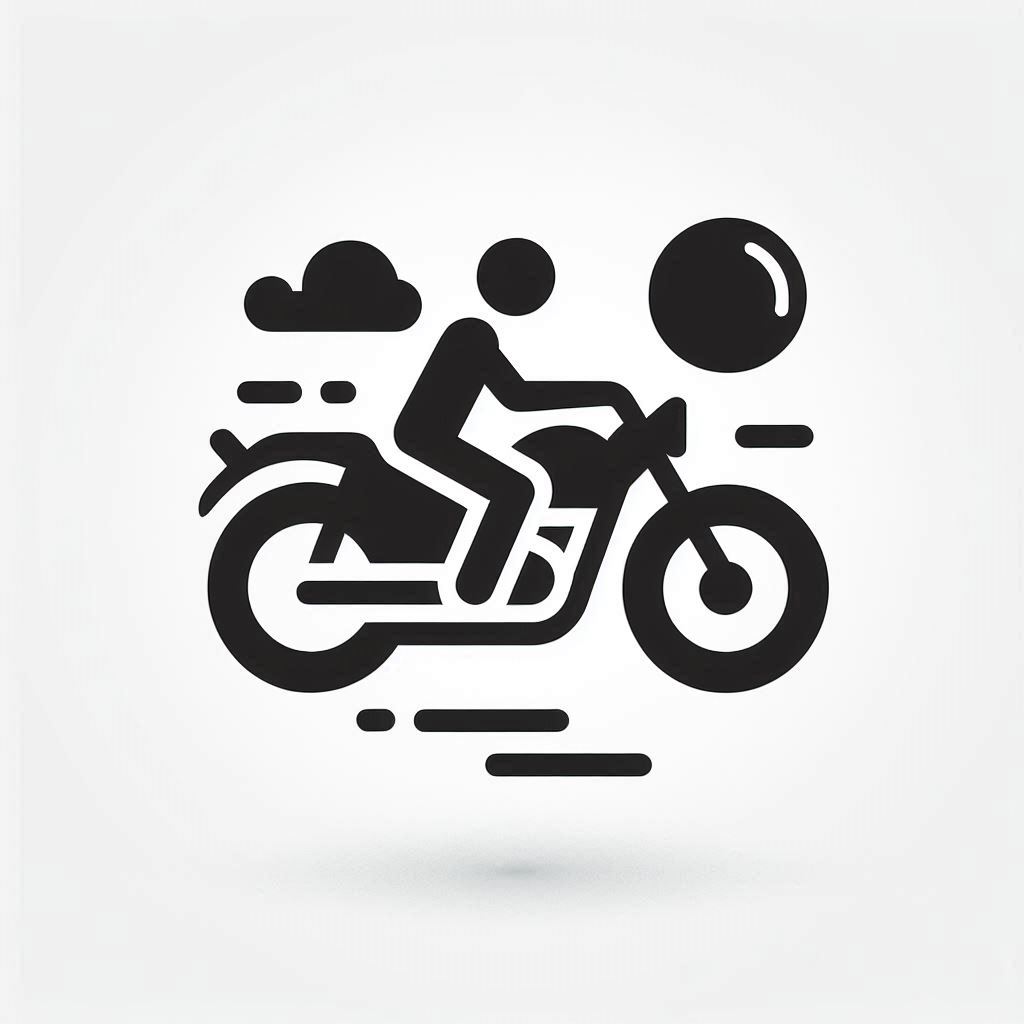 A simple black silhouette of a person riding a motorcycle at a high speed, with clouds and a sun in the background.