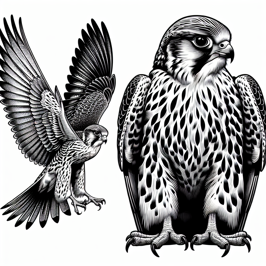 animal, art, avian, bird, detailed, drawing, falcon, feathers, flying, graphic, illustration, line, nature, perched, predator, raptor, realistic, talons, wildlife, wings