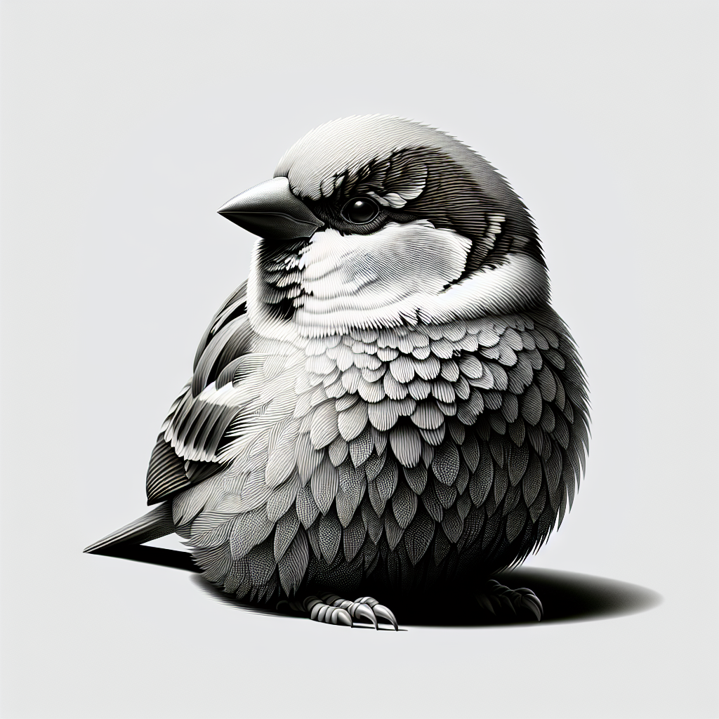 A black and white drawing of a sparrow with detailed feathers sitting on a white background.