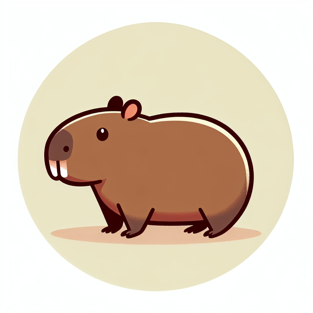 A cartoon capybara with large teeth and small ears is standing on a beige background. It has dark brown fur and white teeth.