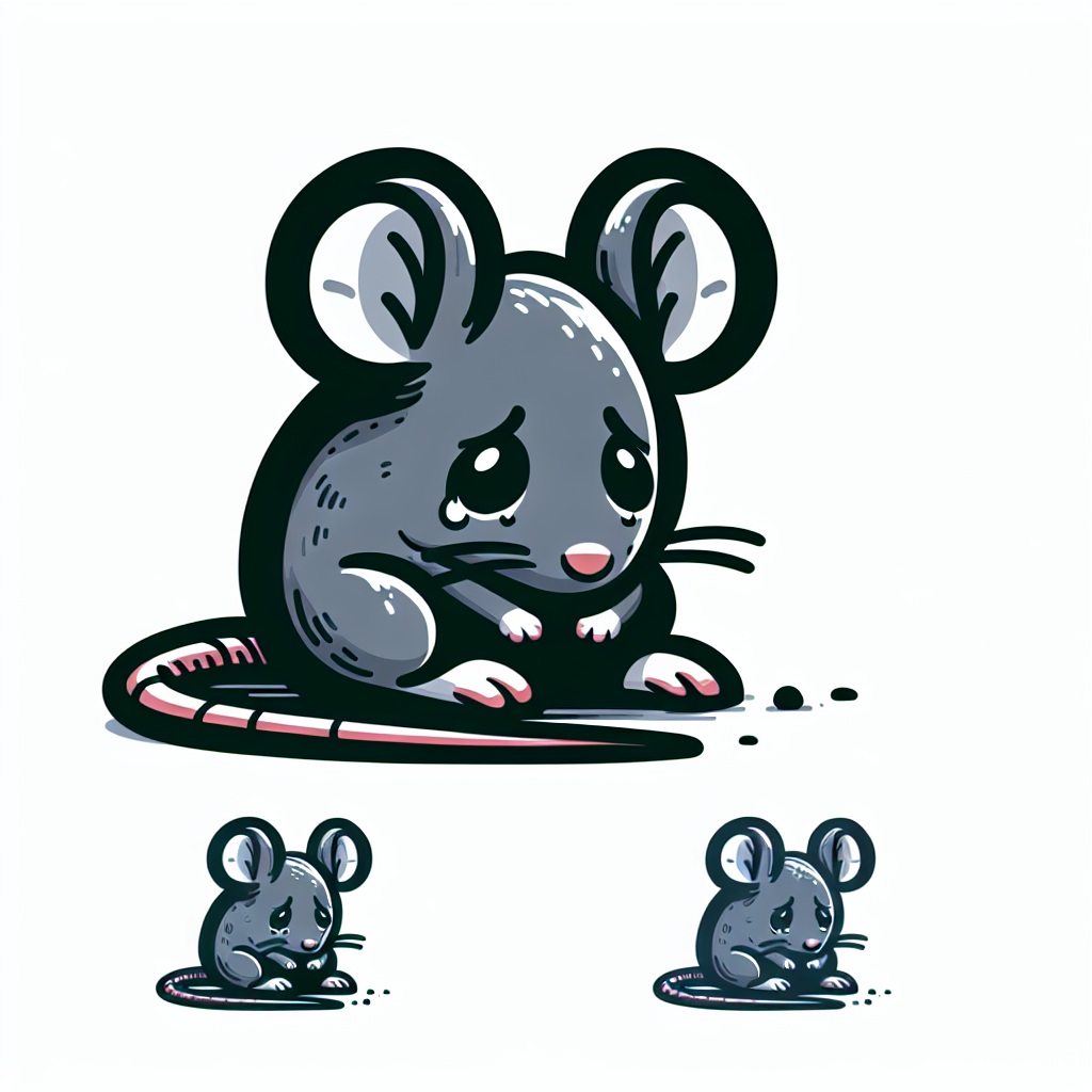 A cartoon mouse is depicted with large, teary eyes, sitting on a white background